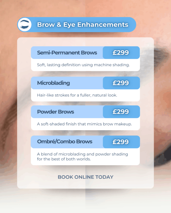 Semi-permanent makeup, also known as micropigmentation, is a treatment that enhances your natural features by implanting pigment into the skin. It’s perfect for defining brows, eyes, or lips — giving you a polished look that lasts without the need for daily makeup.